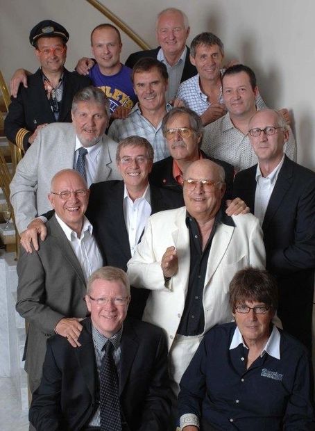 Standing from left: Pearly Gates, Peter Roberts, Timmy Mallett, Kenny Tosh, Mike Knight, Tony Prince, David Jenson, Stuart Busby, Mike Read, Peter Antony, Mark Wesley, Golly Gallagher, Adrian John