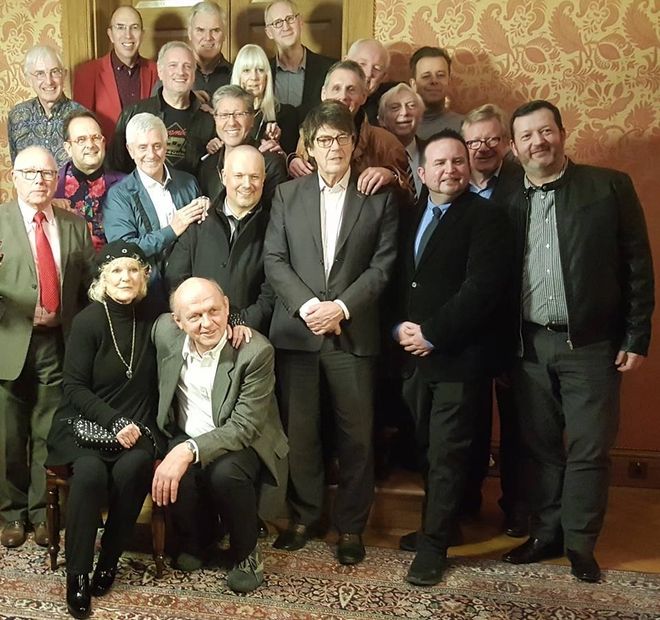 Left to right : Stuart Busby, Pete Roberts, Mike Knight, Tony Adams, Graham Dene, Pearly Gates, Tony Prince, Jonathan Miles, Les Adams, Paul Newman, Mike Hollis, Dave Lee Travis, Shaun Tilley, Peter Antony, Adrian John, Mike Read, Bob Lawrence and Howard Pearce